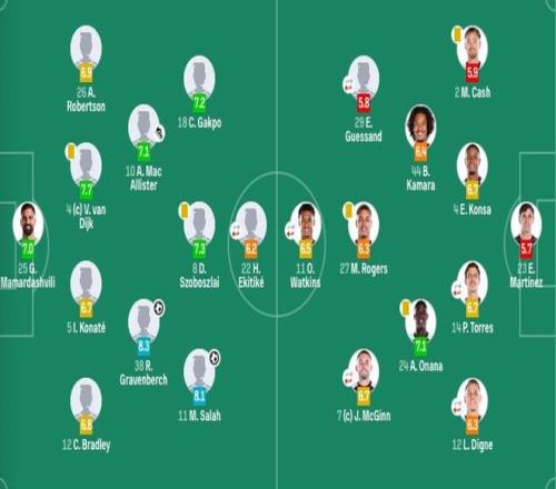 利物浦首发:25-马马尔达什维利、4-范戴克、5-科纳特、12-布拉德利、26-罗伯逊、8-索博斯洛伊、10-麦卡利斯特、38-赫拉芬贝赫、11-萨拉赫、18-加克波、22-埃基蒂克(77'7-维尔茨)